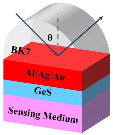 Z. Lou et al. have synthesized nanoparticles-organic clusters (NOCs) and used them as signal amplification reagents, gaining four times higher SPR signal compared to the sandwich format [26,27]. A highly sensitive sensor with a separate GeS layer is proposed in our design. In our SPR sensors, we put an Al/Ag/Au film on the surface of a BK7 coupling prism, and then put the GeS layer as a biological sensing layer on the top of the Al/Ag/Au layer, seen in Figure 2. BK7 glass is coupling prism, and the GeS monolayer thickness is 0.524 nm [28,29]. As an SPP primary metal, an Al/Ag/Au film of 50 nm is selected [30]. The BK7 glass refractive index can be expressed [30] using the next equation: