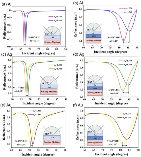 We selected BK7 glass as the coupling prism for our designed GeS biochemical sensors, due to its low refractive index [35]. Traditional SPR sensors, such as the Kretschmann geometry biochemical sensors, mainly include a simple metal layer to measure the SPPs, as shown in Figure 3. The sensitivities of conventional Al, Ag, and Au metals are 111°/RIU, 117°/RIU, and 139°/RIU, respectively. When using the BK7 glass prism, they are shown in Figure 3a,c,e, respectively. However, these values are not ideal for the sensitivity of biochemical sensors. To improve the sensitivity of the sensor, we developed an SPR biochemical sensor using GeS material. We put the addition of the GeS material on the surface of metallic Al/Ag/Au layer, and then the detection target flow past the 2D material surface in the structure, using this way to increase the sensitivity of the biosensors. In Figure 3b,d,f, the charts show that the sensitivities are greatly improved when the GeS material is introduced in the previous sensor structure. The sensitivities of these sensors obtained for the Al, Ag, and Au metal layers are 320°/RIU, 295°/RIU, and 260°/RIU when the GeS layers accumulating to 33, 28, and 18 layers, respectively.