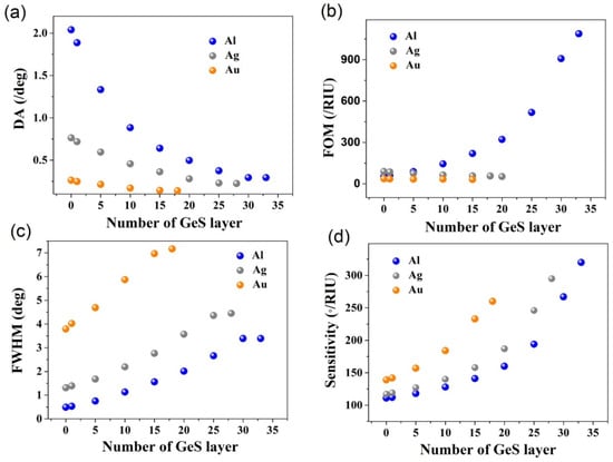 The properties of the sensors are also impacted by the GeS layer numbers. Figure 4 shows the changes in DA, FOM, and FWHM, and sensitivity with the number of GeS layers at 633 nm, with the incident angle ranging from 34.65° to 34.85°. DA is a key factor to reflect the functions of biosensors. As can be seen from the curves in Figure 4a, as the number of GeS layers changes between 1 and 35, DA presents a downward trend. This is due to the application of a germanium sulfide layer to widen the reflection curve. Although DA decreases with the increase in GeS layers, DA remains high. In Figure 4b, FOM is the specific value of the sensitivity to the FWHM in the reflectance curve. GeS-Au based biosensor FOM augments as the number of GeS layers increase, and the GeS-Al and GeS-Ag based biosensors do not exhibit significant change. Figure 4c shows that GeS layer numbers have an important effect on reflectivity. With increasing GeS layer numbers, the inclination of the SPR reflectivity curve becomes shallower and the FWHM widens due to the absorption of the GeS layers. Figure 4d indicates the change in the peak sensitivities of the SPR biosensors based on GeS-Al, GeS-Ag, and GeS-Au at the wavelength of 633 nm with the number of GeS layers (L). The SPR biosensors based on GeS-Au have higher sensitivity than GeS-Al and GeS-Ag SPR biosensors when they are at the same layers. The SPR response of Al and Ag layers is more sensitive than that of Au layers, but the chemical stability is lower. The GeS layer is an important part of the SPR sensor, which can prevent the oxidation of the oxidizable Al/Ag/Au metal, enhance the absorption of the sensing medium, and improve the stability and biocompatibility of the biosensor structure.
