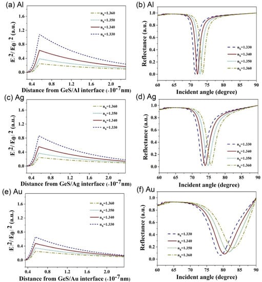 The electric field distributions corresponding to the resonance angles are shown in Figure 5a,c,e. When the detection target refractive index is from 1.33 to 1.36, the electric field at the GeS/sending medium interface obviously varies dramatically. This indicates that the GeS based sensors are sensitive to small changes when checking detection target. When the refractive index of the detection medium on the contact surface changes a little bit, the surface wave property will have a large change, and then it will lead to a change in the electric field. Figure 5b,d,f shows that the changes in reflectance with the incident angles increase with increasing detection target refractive index, and the incident angles corresponding to the resonance angles increase. From ns = 1.33 to ns = 1.36, the resonance angles are 75.205°, 77.145°, 79.395°, and 82.150°, respectively.