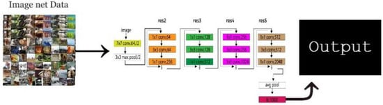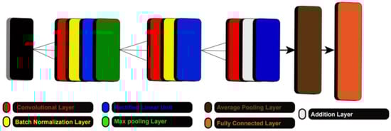 Feature extraction is the process of reducing original images into small number of important information groups. These groups are called features. The features have few important characteristics such as color, shape, texture, and location of an object. In this proposed technique, we utilized a pre-trained deep learning network named ResNet101. Originally, this model consists of total of 101 layers and was trained on ImageNet dataset. A visual flow is shown in Figure 3. Note that the filter size of first convolutional layer is , stride is 2, and number of channels is . In the next, a maxpooling layer is applied for filter size and stride is . Five residual layers are included in this network, and lastly, global average pool layer and FC layer are added following a softmax layer.