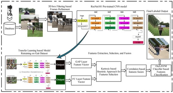 The proposed method for real-time human gait recognition is presented in this section with detailed mathematical modeling and visual results. The following steps are involved in the proposed framework: video preprocessing, deep learning features extraction using transfer learning, kurtosis-based features selection, correlation-based features fusion, and finally, one-against-all-SVM (OaA-SVM)-based classification. The main architecture diagram is shown in Figure 2. The proposed method is executed in a sequence, and at the end of the execution, it returns a labeled output and numerical results in the form of recall rate, precision, accuracy, etc. The details of each step are given below in the following subsections.