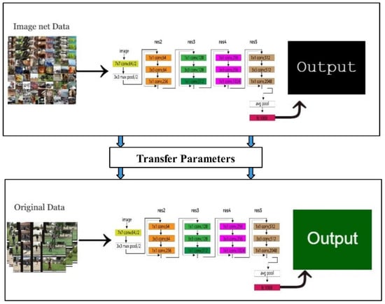 Training Model using Transfer Learning: In this work, we use ResNet101 pre-trained CNN model for features extraction [40]. We trained this model using transfer learning, as visually shown in Figure 4 [41]. Note that parameters of original ResNet101 pre-trained model are transferred and trained on the real-time captured gait database. We remove the last layer from modified ResNet101 and extract features. The features are extracted from global average pool (GAP) and FC layers. Mathematically, TL can define as follows: given a source domain and learning task , a target domain and learning task , TL improves the learning of a target predictive function in the using the knowledge in and , where or . After this process, we obtain two feature vectors from GAP and FC layers of dimensions and , respectively.