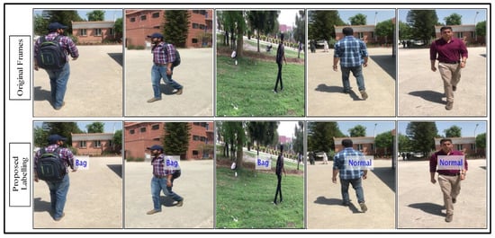 Resultant visual results are also shown in Figure 5, in which the classifier returned a labeled output such as walking with bag and normal walk. The numerical results are also computed and described in Section 4.