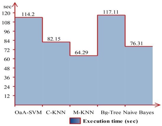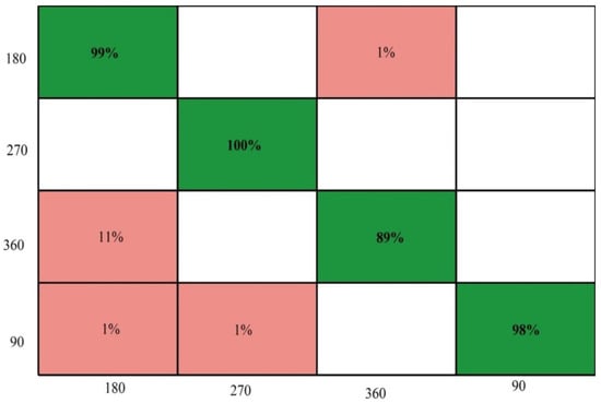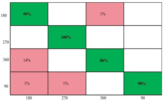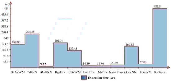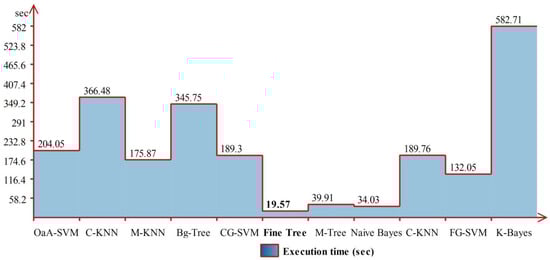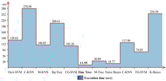 The performance of OaA-SVM can be further verified through Figure 10, which shows that the prediction accuracy for the 270° angle is the maximum (100%), whereas correct prediction performance for 360° is 89%. The execution time during the recognition process is also tabulated in Table 2 and shows that the Medium Tree classifier executed much faster compared to other listed classifiers. The execution time is also plotted in Figure 11, which shows a huge variation due to the classifier’s complexity.