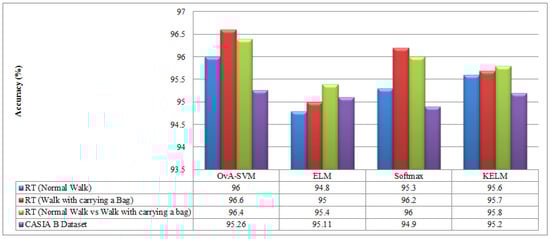 A detailed analysis is also conducted through confidence intervals. For this purpose, the proposed framework is executed 500 times for both datasets. For the real-time dataset, we obtained three accuracy values—maximum (96.8%), minimum (95.3%), and average (96.05%). Based on these values, the standard deviation and standard error mean (SEM) are computed and obtain values of 0.75 and 0.5303. Similarly, for the CASIA B dataset, the standard deviation and standard error mean value are 0.56 and 0.3959, respectively. Using standard deviation and standard error mean values, the margin of error is computed, as plotted in Figure 17 and Figure 18. From these figures, it is shown that the proposed framework accuracy is consistent after the number of selected iterations. Moreover, the performance of the proposed framework (OvA-SVM) is also analyzed with a few other classifiers, such as Softmax, ELM, and KELM, as illustrated in Figure 19. From this figure, it can be noted that the proposed framework shows better performance.