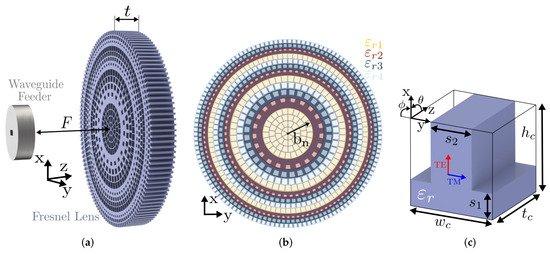 Fresnel lens design: (a) 3D view of the lens and the waveguide feeder. (b) Planar view of the subzones. (c) Dielectric unit cell with T-shaped geometry.