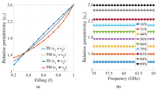 (a) Relative permittivity of the unit cell when the filling factor varies at 60 GHz. The dimensions are: 1 mm. For the case , 0.2 mm and varies. (b) Relative permittivity along the frequency for different filling factors.