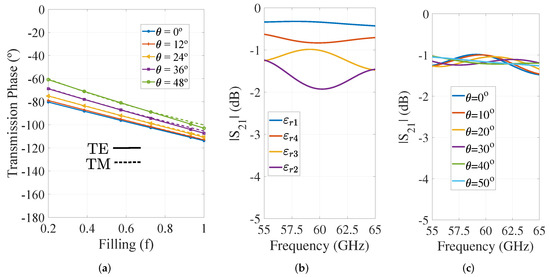 The S-parameters in phase and magnitude of the unit cell with equal dimensions () under oblique incidence was examined in Figure 3. In this case, the thickness of the unit cell was set to 8.94 mm, which is the total thickness of the FL (see Table 1), and dielectric losses (tan 0.02) were also included to accurately evaluate the performance in the magnitude of the proposed unit cell. The maximum angle assessed for oblique incidence () corresponds to the relative position between the waveguide feeder and the outermost Fresnel subzone. Figure 3a shows the variation in the transmission phase between the normal incidence and the extreme oblique incidence ( 48). The smaller the difference between the transmission-phase values obtained for normal incidence and oblique incidence, the less error is introduced in the Fresnel-lens-design equations (mainly Equation (3) from [14]). Thus, being farther away from the center subzones was found to provide the desired constructive interference at the focus of the lens. The transmission phase implicitly takes into account the relative permittivity produced by each oblique incidence angle. The transmission phase difference was at most 20 for the entire filling-factor range and both orthogonal polarizations. This performance was enabled by the T-shaped unit cell with equal dimensions. Moreover, due to the fully dielectric nature of the unit cell in which the dielectric material had a relatively low permittivity (2.6), possible resonances in the unit cell structure were avoided in the target frequency range for both normal and oblique incidence (up to = 48). These possible resonances that may appear at oblique incidence drastically modify the electromagnetic response observed at normal incidence. On the other hand, Figure 3b,c present the transmission response in magnitude for the different relative permittivities and oblique incidence angles, respectively. The considered relative permittivities in these simulated results are the ones needed for the FL subzones. Figure 3b shows transmission losses between 0.3 dB and 2 dB for the four required types of unit cell (one for each subzone). The losses observed were produced mainly by two factors: reflection in the dielectric-air interface of the unit cell and dielectric losses due to the loss tangent of the employed resin material. The unit cell with relative permittivity is the one that produces lower losses because it has the closest relative permittivity (1.25) to that of the free space, and it has the lowest amount of dielectric material in its structure regarding the other types of unit cells. In contrast, a unit cell that provides the has higher relative permittivity and contains more dielectric material in its structure. In consequence, it provides higher losses in the transmission coefficient as was expected for the two above factors. In Figure 3c, the transmission coefficient for different oblique incidence angles is assessed in the unit cell that provides . As the incidence angle increased, the transmission magnitude slightly varied with respect to the normal incidence case. Therefore, it was demonstrated that the proposed unit cell provides robustness to large oblique incidence angles beneficial for preserving the behavior of the subzones farthest from the center of the lens. This unit-cell characteristic was scarcely analyzed in previous 3-D-printed Fresnel lenses.