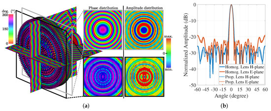 Radiation performance of the Fresnel-lens antenna: (a) Amplitude and phase distributions at 60 GHz. (b) Radiation-patterns comparison with the homogeneous multidielectric Fresnel lens at 60 GHz.