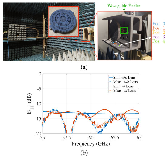 Far-field performance of the printed FL was measured in the anechoic chamber of the University of Granada. Figure 5a shows the measurement setup and the lens prototype. Both insets included in Figure 5a display the same printed Fresnel lens with different light illumination. An antenna holder (illustrated on the right side of the figure) was 3-D printed to align the lens with the OEWG and set the focal distance between them. In addition, the antenna holder contains fixings for moving the FL along its y-direction and, in this manner, assess its scanning performance. These positions are indicated in the figure as well as the OEWG (waveguide feeder). The distance between positions was 6 mm, achieving an offset between the center of the Fresnel lens and the OEWG of 24 mm at the farthest position. The smaller the distance between positions, the higher the resolution of the beam-steering angle. The simulated and measured results for the reflection coefficient with and without the FL are shown in Figure 5b. The lens antenna system provides a good impedance matching (below −10 dB) along the entire frequency band both with and without the FL. This is because the reflection mainly occurs in the radiation of the OEWG. Some differences between simulated and measured results exist due to the use of a WR15 coax-to-waveguide transition that is necessary to connect the OEWG to the vector-network analyzer (VNA). It was not possible to include this transition in the calibration, but it does not alter the measurements since the measured reflection coefficient level is approximately the simulated one in the target frequency range.