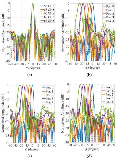 Normalized radiation patterns of the proposed Fresnel lens antenna: (a) E-plane for pos. 0. (b) H-plane at 56 GHz. (c) H-plane at 60 GHz. (d) H-plane at 64 GHz. The simulated and measured results are represented by solid and dashed lines, respectively.