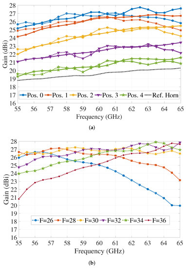In Figure 7a, the simulated and measured gains along the frequency range for the different positions of the lens are shown. It has been included the measured gain of the reference horn antenna (Flann WR15 Standard Gain Horn) used in the measurements to guarantee the correct calculation of the gains. The maximum gain achieved was 27 dBi for the central position. The gain decreased as the pointing angle increased, which was expected from the simulated radiation patterns of Figure 6. For the farthest position (pos. 4), the gain was around 21 dBi, and the pointing angle was 33. This implies scanning losses of 0.18 dB/, which are reasonable for this type of lens. In each measured position, the measured gain agrees with the simulated results, which proves the similarity between the estimated-loss tangent (tan 0.02) and the experimental one. In addition, it is important to note that the beam-scanning capability of the Fresnel-lens design can be assessed because of the use of a low-directivity feeder. If a feeder with higher directivity had been employed instead, the maximum scanning angle would be smaller because the increase in the lens offset would mean that the lens would receive less power to be re-radiated. In the frequency range, the measured crosspolar level was under −23 dB and the mean antenna efficiency (calculated as the ratio of the simulated directivity, and the measured gain) is 79%. Besides, the aperture efficiency without including the antenna losses, which are taken into account in the antenna efficiency, was about 30% at 60 GHz, which was the design frequency. This value for the aperture efficiency was satisfactory for this kind of antenna system, but it can be improved by the use of a feeder with higher directivity such as a horn antenna. This inclusion would increase, for instance, the spillover efficiency, but also, it would significantly increase the cost of the whole antenna system. In addition, in Figure 7a, the agreement between the simulated and measured gain gets poorer at the end of the frequency range. This is mainly caused by the tolerances in fixing the focal distance F. In order to check the effect of this mechanical tolerance in the gain of the lens for Pos. 0, Figure 7b shows the performance of the simulated gain of the FL along the target frequency range when F varies. As it can be observed, F modifies the behavior of the provided gain along the frequency range. From this figure, we can deduce a lower value for the focal distance in the measurement setup since they are the values that produce a decrease in gain at the end of the measured frequency range. Besides this fact, Figure 7b clearly shows the gain stability at the design frequency (60 GHz) when the focal distance is modified and how the distance F can be tuned to the gain values on both sides of the design frequency.