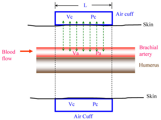 When the cuff bladder is maintained at a low pressure (about 40 mmHg) and ΔVc and ΔPc are very small (about 0.1 mL and 2 mmHg) [19,20], the average compliance of the cuff bladder will be derived from the ratio between ΔVc and ΔPc when the cuff is pressurized at that such small range of pressure levels,