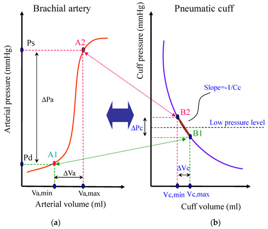 As shown in Figure 1, an air cuff bladder with length L is wrapped around a subject’s upper arm. The air pressure (Pc) and volume (Vc) inside the expanded cuff bladder vary because the blood pressure (Pa) and volume (Va) of the enclosed brachial artery are varied by the pulsatile blood flow. For an L-length brachial arterial segment, a sigmoidal relationship (red curve) between its Pa and Va is shown in Figure 2a. The pulse pressure ΔPa is the systolic pressure (Ps) minus diastolic pressure (Pd). The volume change of the artery (ΔVa) due to cardiac pulsation is the Va,s minus Va,d, where Va,s and Va,d are the volumes of the artery under the systolic and diastolic blood pressures, respectively. We know that ΔVa has an effect on the cuff bladder. According to the ideal gas formula, PcVc = nRT exists in the air cuff bladder, where n is the number of gas molecular particles inside the cuff, T is the absolute temperature in the cuff bladder, and R is a constant. When the cuff pressure is held under a constant temperature, the value of Pc multiplied by Vc is a constant. In other words, Pc is inversely proportional to Vc. Such a relationship (purple curve) between Pc and Vc is shown in Figure 2b. The relation of volume changes in the artery and cuff bladder due to cardiac pulsations can be expressed as