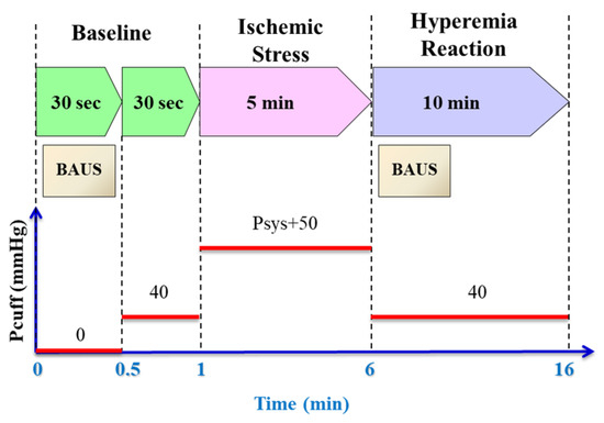 The experimental protocol consists of a 30 s baseline, 5 min ischemic stress and 10 min hyperemia reaction.