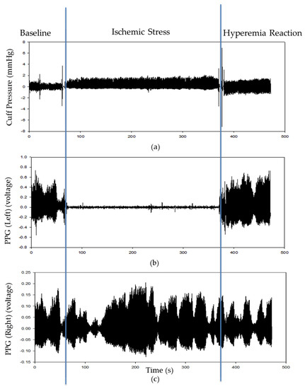 Figure 4 shows three synchronous signals, including a cuff-pressure signal and two PPG signals for subject #37 in the control group during the FMD measurement. Figure 4a is the cuff-pressure signal (i.e., the ac components) after passing through the digital high-pass filters, and Figure 4b,c are the PPG signals measured from the left and right hands, respectively. When the cuff pressure was rapidly inflated to sys + 50 mmHg or rapidly deflated to 40 mmHg, the transient response of the digital high-pass filter affected the baseline of the cuff pressure signal. Thus, the baseline of the cuff pressure signal in the ischemic stress and hyperemic reaction is shifted up and down. The PPG signal of the left hand is used to measure the FMD ratio, and the PPG signal of the right hand is compared to the hyperemia reaction of the left hand. In the ischemic stress phase, the cuff-pressure signal has some noise because the compliance of the cuff bladder at high pressure is very low. Moreover, because the blood flow of the right hand is not occluded, the PPG signal shows the pulse waves in the ischemic stress phase. In contrast, the pulse waves do not appear in the PPG signal of left hand in this phase. These results demonstrate that the blood flow of the left hand is occluded.
