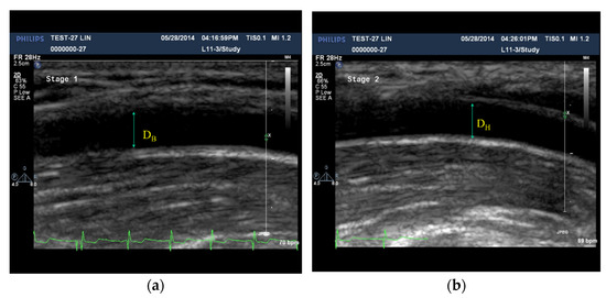 (a) The BAUS image used to measure the diameter (DB) before the ischemic stress, (b) the image by BAUS used to measure the diameter (DH) in the hyperemia reaction phase.