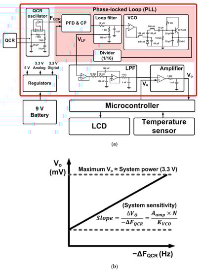 Designed QCM measurement system: (a) a block diagram of the PLL-based measurement system and (b) system output voltage to input frequency shift.