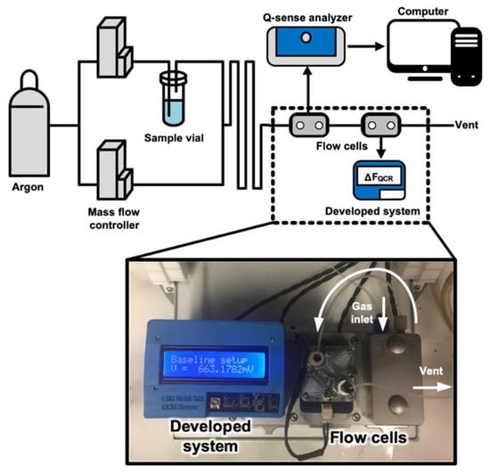 The carrier flow rate (Fc) and the sample flow rate (Fs) were independently controlled by a digital mass flow controller. A total flow rate (Ftotal) of 100 sccm was maintained during the entire experiments and sample flow ratios (Fs/Ftotal) of 0.1, 0.2, and 0.3 were applied with 3-min intervals. Once a set of experiments was complete, the VOC sample vapor was removed from the QCR surface by purging with pure argon gas until the system response recovered to the baseline. A representative schematic of the experimental setup is depicted in Figure 3.