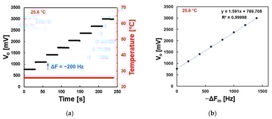 System sensitivity is the key parameter to estimate input frequency shifts in the PLL-based QCM measurement systems [,]. In our work, DAC values were determined to produce the baseline voltage between 500 mV to 1000 mV. The system output voltage was measured by applying incremental input frequency changes, and the resultant system output at each interval was averaged to obtain the system sensitivity, as shown in Figure 4. From the analysis of the linear regression data presented in Figure 4, the system sensitivity was calculated to be 1.60 mV/Hz at 25.6 °C.