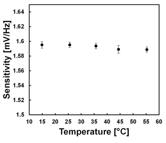 The temperature dependence of the system sensitivity was investigated as well. The developed system was placed on a hot plate (PC-420D, Corning) and covered with a styrofoam box to control and maintain the system temperature. Temperatures from 15 °C to 55 °C were maintained and the corresponding system output voltages were recorded. The system sensitivity was calculated as described above, at each temperature.