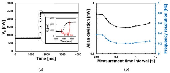 Allan deviation analysis was performed to investigate the frequency resolution of the developed system. Firstly, the minimum measurement time was tested by measuring the transition time of the output voltage as shown in Figure 6a. A step frequency change of −1000 Hz was applied, and the output voltage was measured by a microcontroller at the sampling rate of 1 kHz. The measured transition time of 10 ms means that it takes a time delay of 10 ms to represent accurate temporal frequency changes. A plot of the Allan deviation is shown in Figure 6b, as obtained based on continuous collection of the system output voltage for one hour.