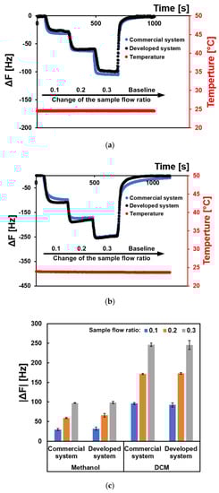 Figure 7 shows the change of frequency responses over the experimental time for the developed electronic system (black points) and for the commercial system (Q-sense Analyzer, Biolin Scientific) (blue points). The results shown in Figure 7a,b demonstrate that the developed electronic system showed similar response patterns to the patterns obtained with the commercial system. As the sample flow ratio increases from 0.1 to 0.3, the concentration of the analyte also increases, resulting in larger frequency shifts. Previous reports demonstrated that sensor frequency responses can vary upon exposure to different VOCs as a result of inherent differences in chemical properties [,]. The sensor employed in this work displayed reversible sorption of both VOC samples, which also exemplifies the reusability of the GUMBOS sensor in this miniaturized QCM setup. Three replicate measurements were performed for the analysis. Figure 7c shows more stable responses with methanol than with DCM in both measurement systems due to the higher volatility of DCM than methanol. With the commercial instrument, the standard deviations of the measurements ranged from 0.82 Hz to 2.45 Hz with methanol and from 1.38 Hz to 4.63 Hz with DCM, respectively. With the miniaturized system, the standard deviations of the measurements were calculated to be 2.69 Hz to 4.64 Hz with methanol and 1.86 Hz to 11.45 Hz with DCM, respectively. Although the developed system was determined to have larger deviations, the responses of the sensor at each flow ratio were sufficient to measure relative concentrations of each VOC tested.