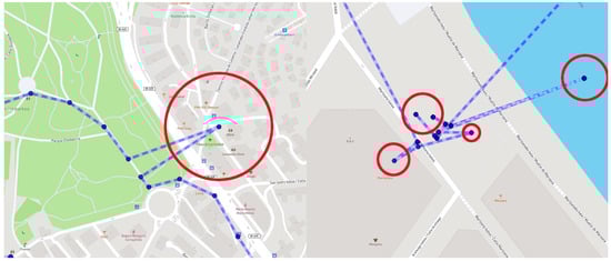 Once the stratification of the clusters has been performed, the labels assigned by DBSCAN are updated. Consecutive numerical labels (starting from the last detected cluster) are assigned to all points that have not been assigned to a cluster by DBSCAN. If several points have the same coordinates, they are considered part of the same cluster (this cluster is a ‘static jump’). A single GPS point that is not part of another cluster because it is a transition within the route will form a single point cluster. Then, the clusters are analyzed to verify if they are ‘static jumps’ (all points of the cluster have the same coordinates). Finally, a map of relationships between the different clusters is generated based on the inputs/outputs between the clusters. This information is especially relevant to try to detect the multi-clustering error described above.
