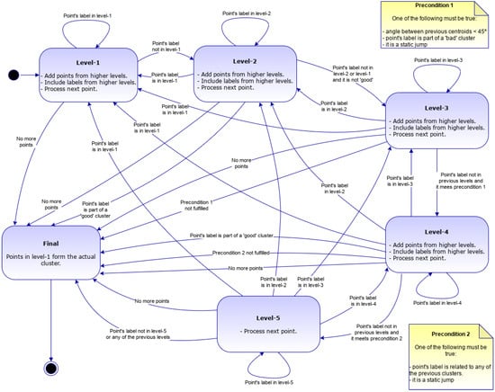 - Level 4: As in the other levels, the label of the next point on the route is checked. If it is a level 1 label, it is returned to this level and the labels of levels 2, 3, and 4 are added to level 1. If it is a level 2 label, it is returned to this level and the labels of levels 3 and 4 are added to it. Otherwise, and as long as the point label is not part of a cluster labeled as ’good’ (in which case the process ends directly), a previous check is made again before passing to level 5, if the current point label belongs to a cluster related to any of the clusters (labels) belonging to level 4, or if the current point is static, it is passed to level 5 (as always, using the label of this point as the initial label of level 5). If the condition is not fulfilled, the process ends, the rest of the levels do not belong to the cluster, and only the points belonging to level 1 are part of the real cluster.