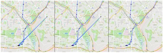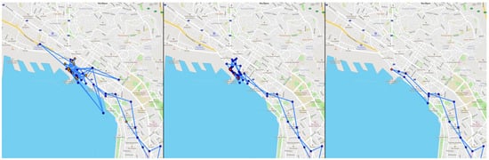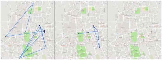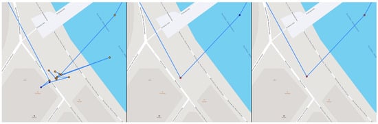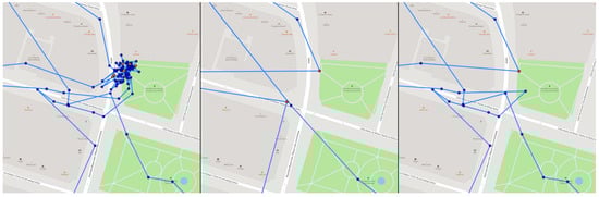In the route that can be seen in Figure 10, we have a clear example of multi-clustering. At first, it seems it is a normal route, but after a thorough analysis we realize that the user has not really left the home and the rest all the points are a mix between GPS drifts and static-jumps. The first iteration (center) is able to deal with some of the drifts, but the static-jumps confuse this algorithm and it is unable to clear the route correctly. Thanks to the multi-clustering method of the second iteration, the route is perfectly cleaned and it marks just the point that identifies the user’s home.