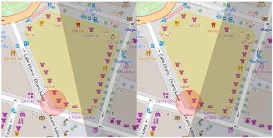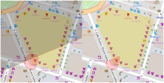 In the example of Figure 8, we can see a big cluster of points (the big cloud of points on the left). Both algorithms can clusterize it correctly thanks to the underlying DBSCAN algorithm that both interactions use. However, the first-iteration erroneously clusterizes some other points that are not a real cluster but a change of trajectory of the user. Reducing the eps of the initial DBSCAN from 25 m to 9 m allows the second iteration to avoid making this mistake.