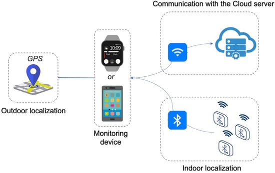 The proposed indoor location system consists of a monitoring device used to gather positioning data inside a building, several Bluetooth Low Energy (BLE) beacons arranged in the monitored indoor environment, and a Cloud server for data collection and processing (see Figure 28). To maintain a low-cost infrastructure, a smartphone or a smartwatch has been chosen as a monitoring device. Moreover, another advantage of these devices is that they are now commonly used by all users, making them ideal candidates for location monitoring in different environments. In particular, a smartwatch can be worn by a user for the whole day ensuring continuous detection. Furthermore, the use of such devices allows to capture also other data using on board sensors and to transmit them using available communication interfaces (e.g., GPS, BLE or Wi-Fi). In the proposed solution, the BLE interface is employed, together with BLE beacons, for indoor localization, whereas the GPS is used to retrieve information about the outdoor position of a user. Finally, the data is sent to the Cloud server for its storage and analysis through the Wi-Fi or Long-Term Evolution (LTE) interfaces.