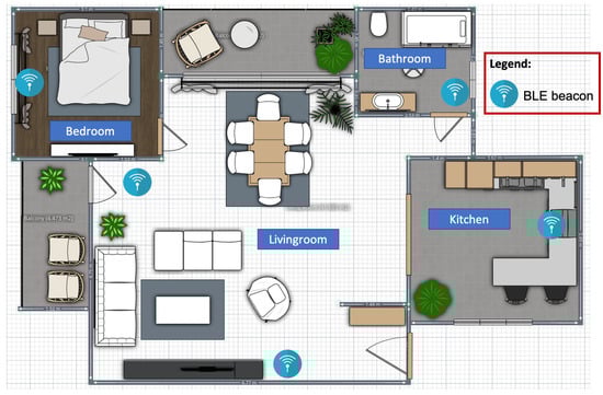 To explain how the indoor tracking system works, a building with multiple rooms has been considered as an indoor environment, where each room is identified by one or more appropriately installed BLE beacons in order to generate as uniform a signal as possible in the room. Each of those rooms could be considered a POI. Figure 29 shows an example of an environment consisting of four rooms with five beacons placed. The monitoring device runs an application that performs repeated Bluetooth scans and detects nearby beacons. When the user moves inside the building, the application will perform at least three consecutive scans, each of them lasting about 10 s. Moreover, the device needs a few seconds so that the integrated BLE interface can detect all nearby beacons. Then, the result of each scan includes a list of detected nearby BLE beacons stored in the device memory. These information is analyzed through an algorithm that performs an approximation based on the measured Received Signal Strength Indication (RSSI) value of each detected beacon.