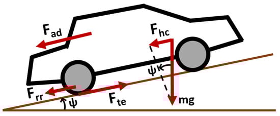 The force propelling the vehicle forward (i.e., the tractive effort Fte) has to accomplish the rolling resistance Frr, the aerodynamic drag Fad, the force needed to overcome the component of the EV weight acting down a slope Fhc and the force to accelerate the vehicle Facc. Thus, the tractive effort is the sum of all these forces, as shown in Figure 2, and it can be expressed as follows [25,26]: