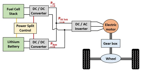 Given the dynamic performance of the FCV, fuel consumption is an important performance indicator of the FCV propulsion system affecting the driving range, as the possibilities to carry abundant quantities of hydrogen onboard are limited and expensive [8,9]. Assuming reduction in fuel consumption as the goal, the design procedure of an H-ESS for FCVs consists of finding the sizes of the FC stack and Li-B modules reducing fuel consumption under the condition that the specified driving cycle is feasible. The fuel consumption also depends on how the H-ESS is managed. This is defined by the power split control, which computes the amount of power that the FC stack and Li-B modules have to provide in order to satisfy the power demand of the FCV propulsion system.