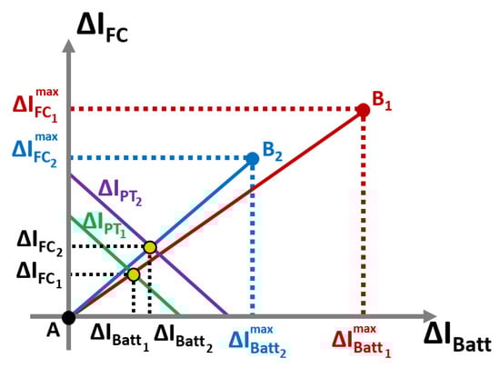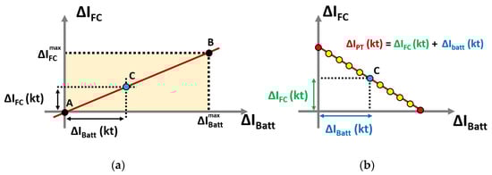 In more detail, given a value, the algorithm computes the values of the FC and Li-B current variations ∆IFC and ∆IBatt, respectively, by finding the point of intersection between the straight line defined in Figure 6a and that in Figure 6b (i.e., by solving Equation (12)):