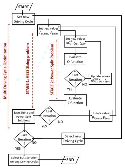 The block diagram of the solution algorithm for the proposed H-ESS sizing problem is shown in Figure 9. First, one of the driving cycles included in a defined set is selected. Then, given a driving cycle as input, the two-stage procedure for the optimal H-ESS sizing and the selection of the optimal parameters for the power split strategy is performed. In more detail, stage one deals with the joint sizing of the FC stack maximum power and Li-B maximum capacity. At each iteration of stage one, given tentative values of PFCmax and EBmax, the optimal parameters of the power split are computed by minimizing the objective function in Equation (18) in stage two. Given the optimal results of stage two, it is possible to evaluate the objective function in Equation (15), update the tentative values of PFCmax and EBmax, and repeat the same steps until convergence.