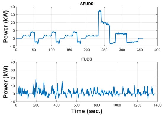 Starting from the FCV’s initial weight, in Figure 12 and Figure 13, we show the electric power supplied from the H-ESS to the DC-link when the FC test vehicle followed the various driving cycles. In particular, while the NEDC and SFUD are characterized by several constant acceleration and speed phases, the FUDS and WLTP continuously present fast variations in speed (i.e., electric power absorbed by DC-link), requiring good performance in terms of H-ESS dynamics.