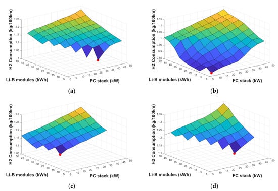 The above steps are repeated until the optimal sizing of the H-ESS and its related parameters of the power split strategy are obtained for each driving cycle within the given set. To find the design solution that fits the requirements of each driving cycle, we selected the sizing solution characterized by the maximum value of both the FC stack and Li-B capacity among each found sizing solution. If the sizing solution with maximum value of both the FC stack and Li-B capacity did not exist, we identified the two sizing solutions characterized by the maximum value of the FC stack and the maximum value of the Li-B capacity, respectively. Thus, the design solution between these two is obtained by selecting the one that allows for obtaining the best performance in terms of fuel consumption, even if the peak power that the H-ESS can supply is slightly penalized.
