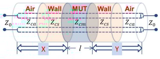 where is the reference impedance of the vector-network-analyzer (VNA) measurement system; , , and are the characteristic impedance of the air-covered transmission lines, SU-8 covered lines, and the MUT loaded line, respectively; , , , , , and are impedance transformers [], which are defined by