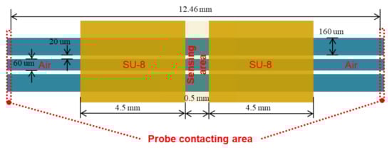 The CPW sensing structure is fabricated on a 4-inch quartz ( = 3.78 and = 0.0001 at 10 GHz and 25 ) wafer. On the surface of the quartz wafer, 650 nm thick Ti/Au CPW electrodes are deposited by the sputtering method and the lift-off technique. The fabrication procedure has been previously described in detail []. Dimensions of the CPW cross-section are 60 m conductor width (w), 20 m spacing width (s), and 160 m width of the ground plane (g), respectively, and the total length of the CPW line is mm. Next, a 400 m high and 500 m wide SU-8 microfluidic channel is patterned on top of the CPW electrodes. Thus, and are both 500 m in (15) for the validation measurements. The channel, where the MUT is flowing, is located perpendicular to the CPW electrodes. Widths of the channel walls are both mm. The structure and dimensions of the designed CPW TL device are shown in Figure 2.