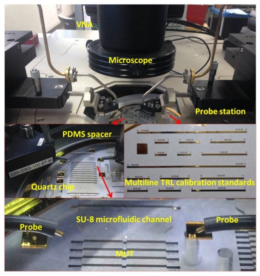 Figure 3 presents the on-wafer measurement setup and the fabricated quartz chip. An Agilent E8364B VNA and a pair of 220-GSG-100-BT-M picoprobes based on a manual probe station are used for the on-wafer measurements. For both the Mutliline-TRL calibration and the practical measurements of the bare sensing CPW line and the DI water loaded CPW line, 201 frequency points are collected in a linear approach. In order to reduce the excitation of the parasitic microstrip mode between the CPW conductors and the metal chuck, an 8 mm-thick plexiglass ( = 2.593 and = 0.022 around 10 GHz) spacer is placed under the quartz wafer when on-wafer measurements are performed. Before any practical measurements, a multiline thru-reflect-line (multiline-TRL) calibration process [] is performed using the designed bare CPW lines and the CPW short circuit. With the help of a multiline-TRL calibration package [], errors caused by cables and adapters between VNA and the probe tips can be precisely determined. Next, two groups of S-parameters are measured on the CPW sensing line, including the empty device (i.e., with air in the microfluidic channel) and the device after loading de-ionized (DI) water []. DI water can be readily injected into the SU-8 microfluidic channel by using a pipette. During the on-wafer measurements, the temperature of DI water is kept at approximately 25 C.