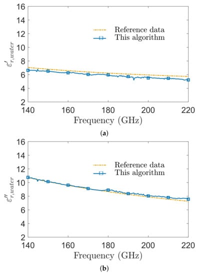 in which T is the actual temperature of DI water in C during the measurement procedure. The other coefficients used in (20) are listed in Table 1. It is clearly shown in Figure 4 that there is a very good agreement between the measurement results and the reference data. This has validated that the proposed simple algorithm can provide accurate and reliable measurement results of liquids’ complex permittivity. It should be noted that although the proposed method is validated within the frequency range from 140 to 220 GHz, it can be applied to both lower and higher frequencies [], as long as either the electrical length of the transmission lines or the dielectric properties of the surrounding materials are obviously different at the frequencies of interest. Since the effects of the feeding parts are not required to be investigated and most of the intermediate parameters are not computed in the code, only a few seconds are needed to obtain the complex permittivity of MUT once the raw measured S parameters are imported. Thus, the proposed algorithm is very fast in broadband permittivity extraction applications.