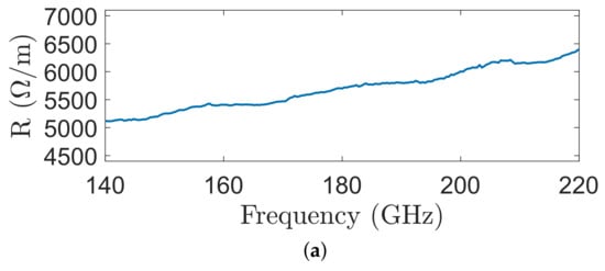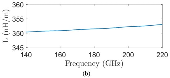 where the conductivity (gold for the CPW lines herein used), the free-space permeability , and the relative permeability of the CPW conductor are S/m, H/m, and 1, respectively. Hence, at 220 GHz, the skin depth of the conductor is approximately nm, which is about one-quarter the thickness of the fabricated CPW conductor, while the designed conductor thickness is equivalent to its skin depth at around 14.64 GHz. Therefore, it is reasonable that R is increasing within the frequency range of interest herein. L is also affected by the conductor skin depth when the conductor’s thickness is smaller than one-fifth of its skin depth. Moreover, during the analysis, the substrate’s permittivity is assumed to be constant; thus, the corresponding CPW TL and are constant and zero, respectively. This assumption is correct at low frequencies, but it might be slightly different at millimeter and terahertz frequencies. This means that the errors caused by the assumption on the substrate can be transferred to the extraction of L and R. Further detailed analysis is needed on the four p.u.l parameters of CPW TLs at high frequencies.
