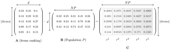 Toy example of the multiplication of two matrices. Matrix A represents scores assigned by the recommendation algorithms to each item and some population P (real value vectors) of the metaheuristic algorithm represented by matrix B. Matrix product C represents new scores for each item , which, after sorting, create new rankings where .