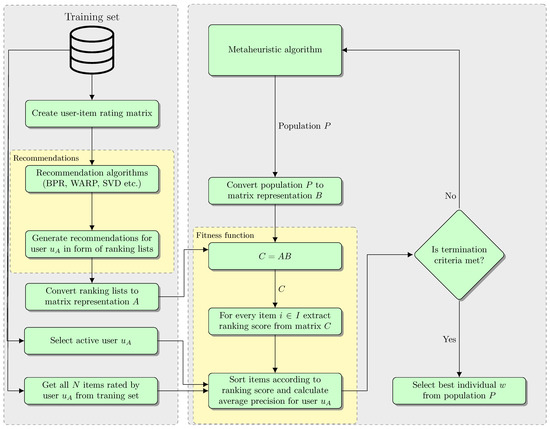 System architecture. The recommendation process is divided into two phases. In the first phase, recommendation algorithms generate recommendations in the form of lists, and active user is selected with all his N items from the training set. In the second phase, a metaheuristic algorithm works (in our case DE) with the dedicated fitness function, which allows for faster calculation of item scores, on the basis of which, new rankings will be created.