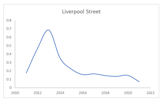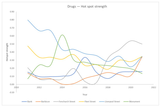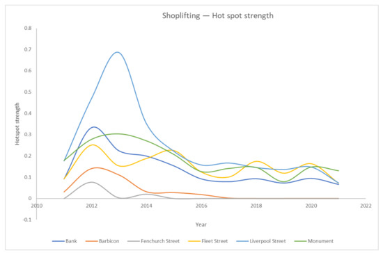 Figure 15 plots the trend of the hot spot strengths detected in the London Street cluster for shoplifting from 2011 to 2021.