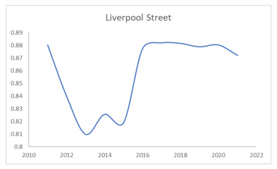 Of particular importance in Figure 10 are the decrease over time of the hot spot strength in Bank (which halves from 80% in 2011 to 40% in 2021) and the increase in Fenchurch Street (which is zero in 2017 and reaches 50% in 2020).
