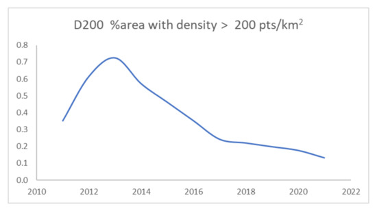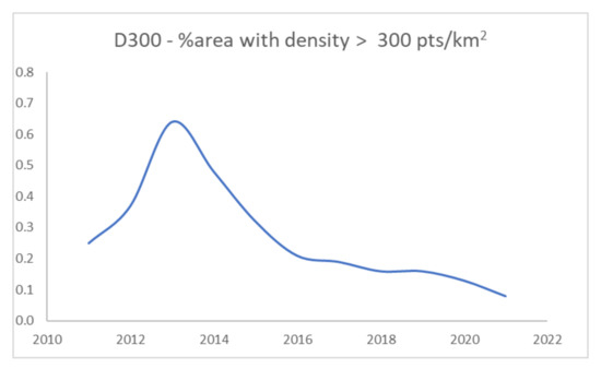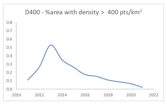 To analyze the presence of correlations between the hot spot strength and the extension of areas with high data point density, the ratio between the extension of areas with annual data point density per square kilometer greater than the threshold and the extension of the Liverpool Street DWO cluster is calculated in each year. Here, we use three threshold values, 200, 300, and 400 data points per square kilometer. Table 2 shows for each year both the hot spot strength and the values of these ratios obtained, with the thresholds set at 200 (D200), 300 (D300) and 400 (D400) data points per square kilometer.